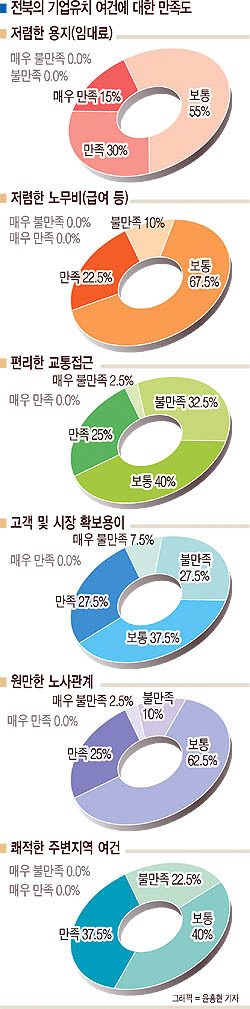 ▲ 비용절감에 후한 점수= 이전기업들이 만족도를 높게 준 항목은 용지 및 인건비 등 비용이 저렴하게 소요되는 부분이다. 저렴한 용지의 경우 만족과 매우 만족이 각각 30%와 15%, 보통이 55%를 차지한 가운데 불만족은 한 곳도 없었다. 저렴한 노무비 역시 불만족이 10%에 그쳤고 나머지는 만족(22.5%)과 보통(67.5%)이라고 평가했다. 또 원만한 노사관계와 쾌적한 주변지역 여건에 대한 불만족이 각각 12.5%와 22.5%에 그친 반면 나머지는 만족 및 보통 수준이라고 응답했다.