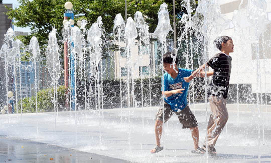수질에 대한 지침이 없어 오염도를 확인할 수 없는 전주 화산체육관 분수대에서 1일 어린이들이 물장난을 치고 있다. 이강민(lgm19740@jjan.kr)