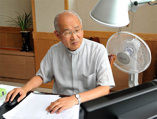 이병호 주교는 생활 속 에너지 절약의 달인이다. 집무실에 들어서자 책을 읽을 땐 사용하는 스탠드와 선풍기가 반긴다. 안봉주(bjahn@jjan.kr)