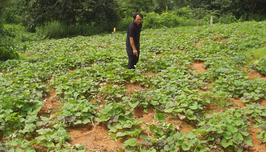 한 농민이 멧돼지로 피해를 입은 고구마밭을 둘러보고 있다. /순창군청 제공 (desk@jjan.kr)
