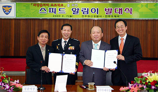전주 완산경찰서(서장 하태춘)는 7일 대강당에서 송하진 전주시장과 박기문 전주우체국장, 스피드 알리미 400여명이 참석한 가운데 '서민생활 보호를 위한 희망울타리 프로젝트' 스피드 알림이 발대식을 가졌다.