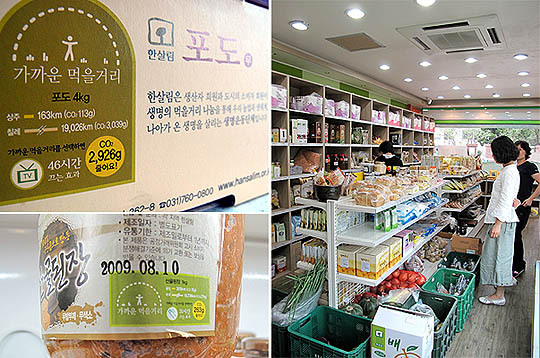'가까운 먹을거리'라는 말과 함께 국내산과 수입산 제품이 배출하는 탄소양을 비교해 놓은 것이다. 또 이로 인해 절약되는 에너지도 함께 표시해 자세히 전달하고 있다.