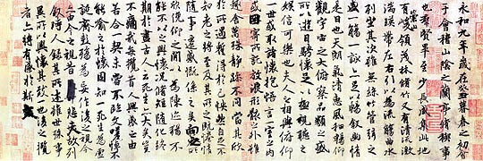 잔치가 끝날 무렵, 시를 한 곳에 모아 시집을 엮자는 말에 모임의 중심이었던 왕희지가 흥을 타고 즉석에서 시집 서문을 지어 쓴다. 세로 폭이 한 자를 조금 넘긴 질긴 견사지(繭絲紙)가 앞에 놓이고 쥐수염으로 만든 예리하고 탄력 있는 서수필(鼠鬚筆)이 놓여졌다. 잠시 흥기된 마음을 가라앉혀 평심정기(平心靜氣)를 이룬 후, 이윽고 필단을 곶추세워 가슴속 깊은 언저리의 흥회를 풀어내기 시작했다. 누구나 그러하듯 붓을 처음 내리 찍을 때는 신중하되 과감하여야 한다. 글씨의 기상과 크기 그리고 절주가 모두 여기에서 비롯되기 때문이다.