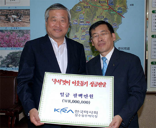 한국마사회장수경주마육성목장(목장장 최귀철)은 22일 어려운 이웃들이 따뜻한 추석을 보낼 수 있도록 관내 저소득세대 185세대와 사회복지시설 3곳에 800만원 상당의 백미를 전달했다.