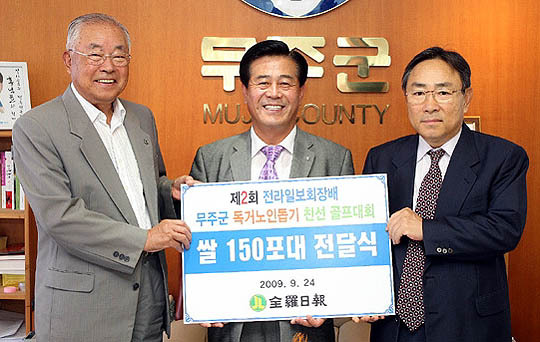 전라일보 유춘택 회장이 24일'제2회 독거노인돕기 무주군 친선골프대회'의 수익금으로 마련한 쌀(20kg) 150포대를 무주군측에 전달했다.