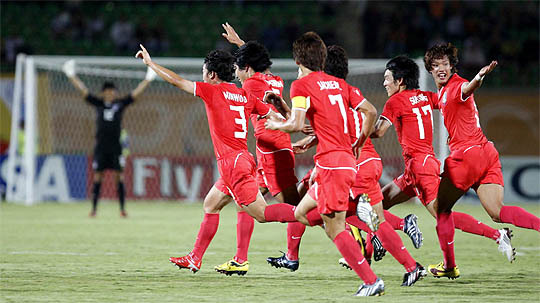 지난 3일 새벽(한국시각) 이집트 수에즈 무바라크 스타디움에서 열린 2009 국제축구연맹(FIFA) 20세 이하(U-20) 월드컵 C조 3차전 한국과 미국 경기에서 한국 선수들이 첫 골을 넣고 나서 응원단 쪽으로 뛰어가고 있다. (desk@jjan.kr)