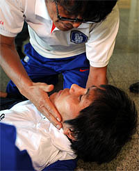 김동진은 의식을 잃고 바닥에 누워 있었고, 최주영 대표팀 의무팀장이 응급조치를 취하고 나서 5분 여 만에 깨어났다. 쓰러지면서 바닥에 부딪혀 코와 윗입술 안쪽에서 피가 흘렀다.