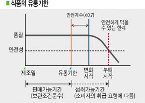 제조업체는 식약청이 정한 '식품의 유통기한 설정기준'에 따라 세균수 등의 위생지표와 산가(酸價) 등의 품질지표를 다양한 방법으로 측정한 뒤 여유기간(안전계수)을 둔다. 식품의 유통기한이 지나도 이 기간에 섭취하면 비교적 안전하지만 식품의 부패가 시작되면 식품의 품질이 현저하게 떨어져 식품 관련 질병을 일으킬 수 있다. (desk@jjan.kr)