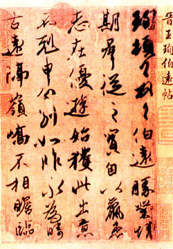 왕순(王珣·349~400)의 자는 원림(元琳)이며, 왕흡(王洽)의 장남이다. 벼슬은 상서령을 지냈으며 왕헌지와 동시대 인물이다. 「백원첩」은 종형제인 왕목(王穆)에게 보낸 서간으로 백원(伯遠)은 그의 자이다. 지금 우리가 숭앙하고 있는 서품들이 대부분 서간이나 제문 또는 비문들이는 점을 상기해 볼 필요가 있다. 이전에 다룬 왕희지 일가의 서품들이 주로 탑모본이나 판각본인데 비하여, 오늘 소개하는 왕순의 「백원첩」은 왕씨 일가의 필적 중 유일하게 진적본이다. 이처럼 희귀한 진적본임에도 불구하고 왕순의 이름이 송대 이전의 기록에는 보이지 않는 것으로 보아 동진시대의 명필 중에 크게 주목을 받지 못했던 듯하다. 송나라 휘종조의 「선화서보(宣和書譜)」 권14에 이 「백원첩」을 논하며 왕순의 서에 대해서도 비로소 언급한 것이 보인다. 그 기록을 간단히 살펴보자.