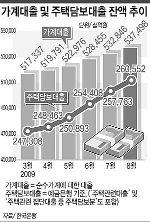 한국은행이 20일 발표한 '8월 중 예금취급기관 가계대출 동향'에 따르면 8월 말현재 가계대출 잔액은 537조4천980억원으로 전월말보다 4조6천522억원(0.9%) 늘었다. 증가폭이 전월의 4조3천906억원보다 약간 커졌지만 6월의 5조4천788억원보다는 작은 수준이다.