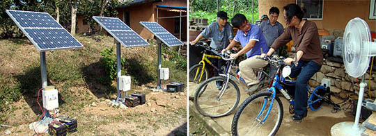 이렇게 만들어진 재생에너지 장치들도 모두 마을에서 만들어냈다. 직접 생산하는 대체에너지의 가능성을 보여주고 있는 셈. 전력을 만들기 위해 자전거도 돌리고 풍력,태양열 발전기를 모두 돌려 24V 가량을 생산하고 있다.