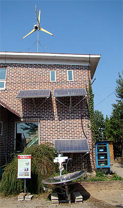 마을의 공동주택마다 지붕에는 풍력발전기가 놓여 있고, 벽에는 태양열 전지판이 설치돼 있다. 또 마당에는 널찍하게 태양열 조리기가 자리를 차지하고 있다.