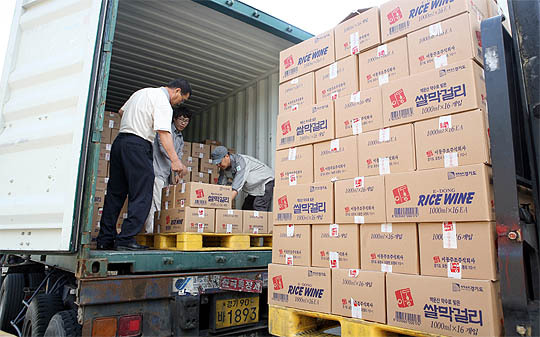 공장에는 수출용 컨테이너가 하루 3번 다녀간다. 1000㎖ 들이 1팩이 16개 들어있는 상자가 컨테이너 1개당 1000개 안팎으로 실린다.