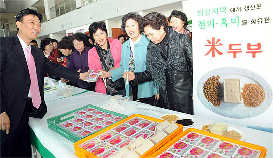 3일 전북대학교 진수당에서 열린 전북쌀 소비촉진 심포지엄에서 참석자들이 부안 청정지역에서 생산된 현미 흑미 쌀로 만든 쌀두부를 시식하고 있다. 이강민(lgm19740@jjan.kr)