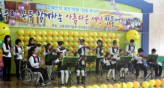완주군 고산면 전북재활학교(교장 이민우)는 5일 오전 학교 강당에서 김순옥 이사장, 김영진 도교육청 교육국장, 박규선 도교육위 의장, 임원규 완주군의장과 학생, 학부모 등 300여명이 참석한 가운데 '2009 장애인식 개선 희망·감동 콘서트'를 개최했다.