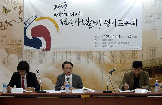 11일 오후 3시 최명희문학관에서 열린 '2009 세계서예전북비엔날레 평가토론회'에서 '세계서예전북비엔날레 프로그램 및 행사운영'에 대해 발제한 김동영 문화포럼 이공 대표는 "현재 서예비엔날레는 예술총감독과 사무국이 그 해 행사 주제를 선정하고 이를 조직위원회 회의에서 인준하는 정도"라며 "아직까지는 큰 무리가 없어 보이지만 이미 고착된 안정된 프로그램의 구성 외에 심도있는 서예의 흐름 파악과 서예비엔날레 및 서예의 방향 제시 등과 같은 역할을 수행하기에는 한계가 있다"고 분석했다.