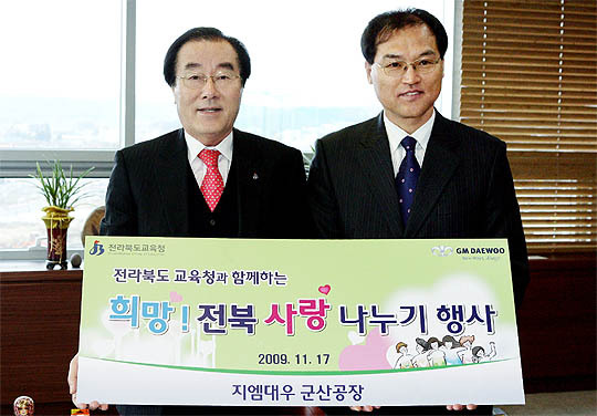 전북도교육청과 지엠대우는 17일 소년소녀가장과 시설 수용학생, 조손가정 등 도내 14개 시·군 중학생 1000여명에게 5000만원 상당의 문구상품을 전달했다.