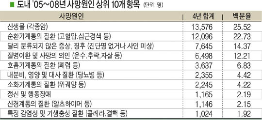 2005년부터 2008년까지 최근 4년 동안 도내에서는 한 해 평균 1만3000여명이 질병·사고 등으로 숨졌으며, 사망원인 1위는 각종 암에 의한 것으로 나타났다.