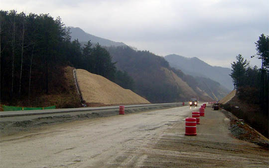 총연장 118㎞, 사업비 2조원 규모로 지난 2004년말 착공된 이 고속도로 공사는 내년말 완공목표로 도로의 골격이 갖춰지며 완주군 상관면 신리·죽림리 등 여러 곳에서 상당한 면적의 야산 산림을 제거, 산등성이의 흙을 드러내고 있다.