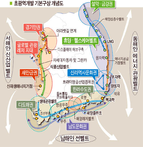 기본구상에 따르면 '서해안 신산업벨트'로 명명된 서해안 일대는 동북아의 국제비즈니스 거점지역이자 초일류 첨단산업의 집결지로 개발된다.