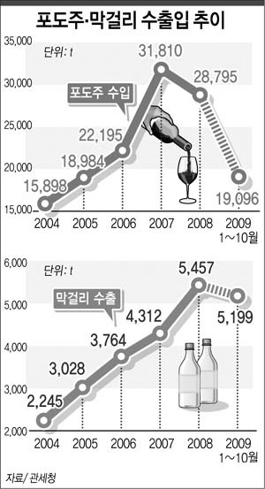 그러나 올해는 경기침체의 여파 속에 막걸리 열풍까지 불면서 웰빙주인 포도주의 수입이 크게 감소한 것으로 분석된다.