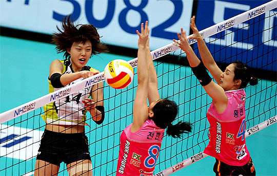 양팀이 같은 레프트이면서 '얼짱 자매'로 유명한 '언니' 한유미와 '동생' 한송이를 서브로 괴롭힌 건 수비를 교란하면서 공격도 묶는 일석이조 효과 때문이다.