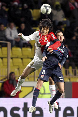 박주영이 21일 오전(이하 한국시간) 모나코 루이2세 스타디움에서 열린 올랭피크 리옹과 2009-2010 정규리그(리그1) 18라운드 홈 경기에서 상대팀 선수와 골 다툼을 벌이고 있다. (desk@jjan.kr)