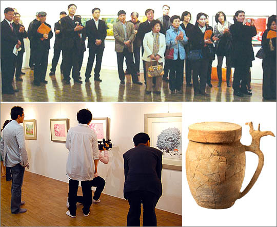 (사진 위)지난 2월 서울서 열린 '전북미술의 비전과 가능성'展. (아래 왼쪽) 7년째 지역작가들을 위해 전시공간을 내 준 익산현대갤러리. '마한, 숨쉬는 기록'전 뚜껑달린 항아리. (desk@jjan.kr)