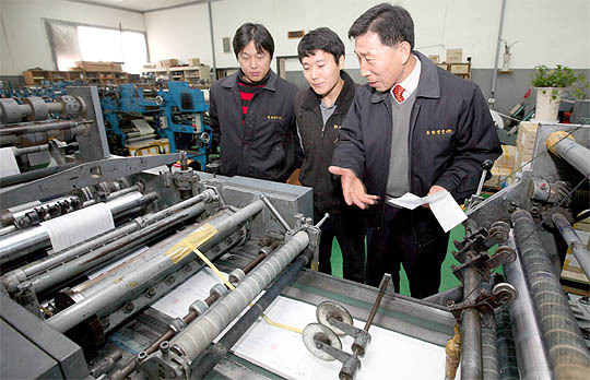 지방세 지로용지, 입출금 명세표 등의 전산용지를 만드는 전주시 팔복동의 동화전산 공장에서 강창원(58·사진오른쪽) 대표가 직원들과 지로용지에 관해 이야기하고 있다. 정헌규(desk@jjan.kr)