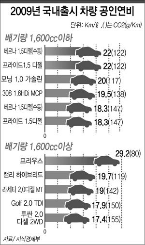 24일 지식경제부에 따르면 프리우스 무단변속 차량의 연비가 29.2㎞/L로 국내 출시 차량 중 월등했고 베르나1.5(경유.수동)와 프라이드1.5(경유.수동)의 연비가 22.0㎞/L로 뒤를 이었다.