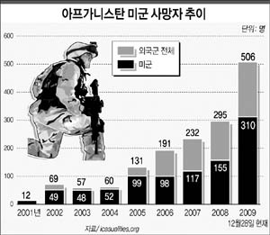 이런 가운데 버락 오바마 대통령이 증파를 결정한 3만명의 병력이 본격적으로 유입되는 내년에는 전사자 수가 더 늘어날 것으로 전문가들은 보고 있다.
