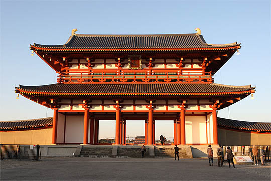 대표적인 복원 건축물은 헤이조쿄 북쪽에 자리 잡은 스자쿠몬(朱雀門). 이 주작문은 유구(遺構)를 그대로 놓아두고 그 위를 1m 정도 흙으로 덮은 뒤 건물을 세운다는 점이 특이하다. 이유는 세월이 지나 새로 지어진 건축물은 사라지더라도 원래 건축물이 있던 자리는 남겨두기 위해서란다.