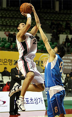28일 오후 서울 잠실학생체육관에서 벌어진 KB국민은행 2009 농구대잔치 결승전 상무-연세대 경기에서 상무 유병재가 상대 블로킹을 피해 슛을 하고 있다. (desk@jjan.kr)