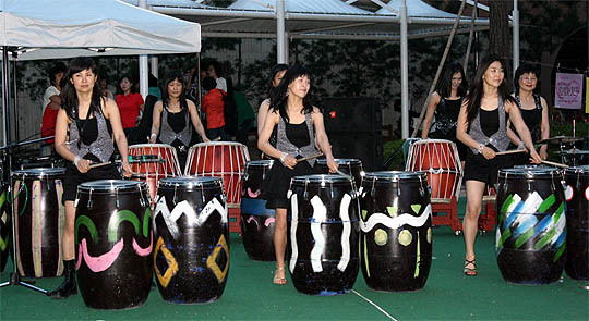 4~5년 전 시작됐던 타악 강좌에서 동호회로 발전된 것은 2년 전. 큰 언니 임민옥씨가 드럼을, 김인덕씨가 카우벨과 템플블럭을, 대북은 윤 희 윤순영 김양금씨가 두드린다. 단장인 김은정씨와 정인주 정경옥 현미섭씨가 드럼통을 맡는다.