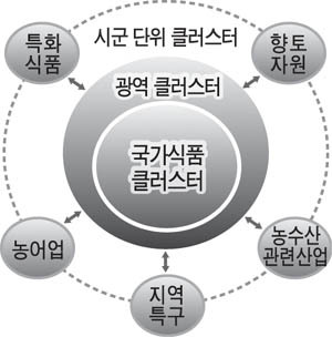 향토산업을 보다 체계화시켜 규모를 확대한 게 지역농업 클러스터. 전국적으로 42개 사업단이 운영되고 있다. 장수의 사과와 임실의 치즈, 전남 보성의 녹차, 경기도 안성의 안성마춤 등이 그것이다.