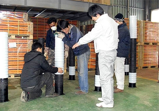 익산시 왕궁면 (주)삼영 시앤알 직원들이 폐자재를 가공해 생산한 '에코 볼라드'와 '점자블록'을 점검하고 있다. (desk@jjan.kr)