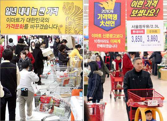 지난 7일 이마트는 삼겹살·목심·달걀·자반고등어·커피 등 12개 제품에 대해 상시 가격 인하를 선언, 가격 전쟁이 시작했다. 롯데마트·홈플러스도 앞다투어 동일 품목에 대해 '급(急)' 가격 인하를 단행하며 이마트보다 10원 이라도 더 싸게 팔겠다는 '맞불 작전'을 펼쳤다.