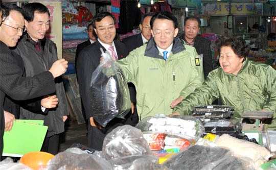 점심을 마치고 찾은 재래시장. 생활고를 호소하는 상인들의 푸념에 노점상인을 위한 비가림 공간, 먹을거리 골목촌 조성 등 지원책을 선물로 내놓았다. 이에 한 아주머니는 "도지사님은 참 젊고 멋있다"며 화답한다.