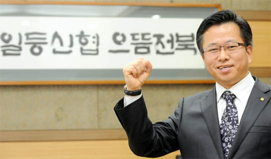 전북신협 양춘제회장이 일등신협 으뜸 전북을 만들겠다며 파이팅을 하고 있다. 이강민(lgm19740@jjan.kr)
