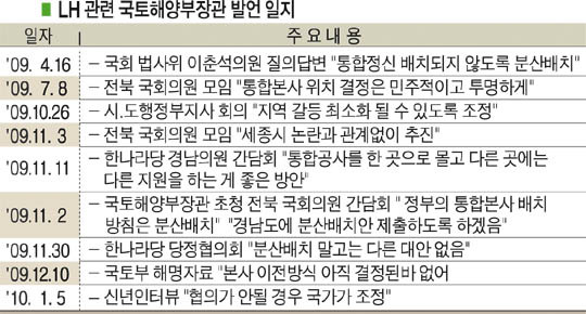 한국토지주택공사(LH)본사 배치와 관련된 국토해양부의 입장이 제갈피를 못잡고 있다는 지적이다.