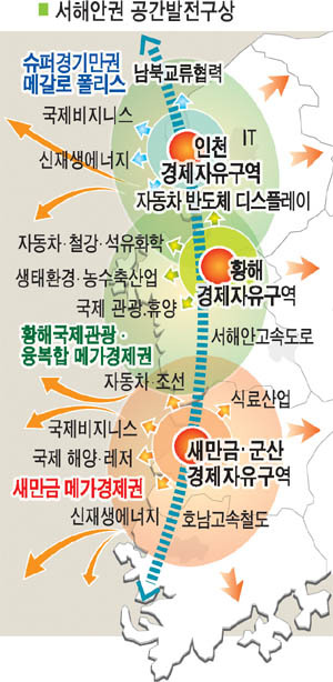 서해안 신산업벨트는 군산과 김제, 부안·고창 등 도내 4개 시·군과 인천의 8개 구·군, 경기도 6개 시·군, 충남 7개 시·군이 대상지역이며, △초일류 첨단산업벨트 △국제 해양·문화·관광벨트 △환황해권 항만비즈니스 물류거점 육성을 위한 인프라 구축사업을 기본 구상으로 설정하고 있다.