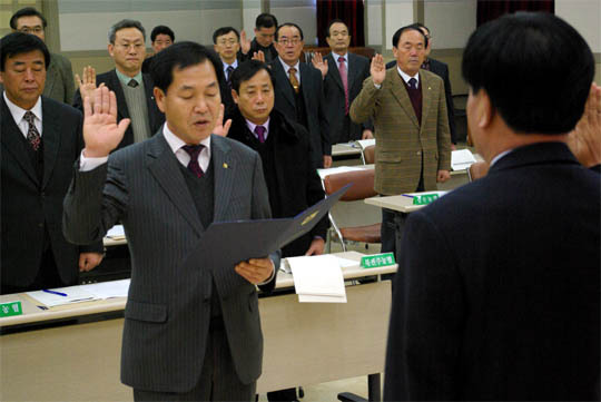 조합장 공명선거 실천결의 대회에 참석한 조합장 등이 깨끗한 선거를 치룰것을 선서하고 있다. (desk@jjan.kr)