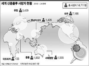스위스 제네바에 본부를 둔 세계보건기구(WHO)는 29일 지난해 4월부터 지금까지 인플루엔자 A[H1N1](신종플루)로 인한 사망자 수가 1만4천711명(24일 현재)에 달한다고 밝혔다.
