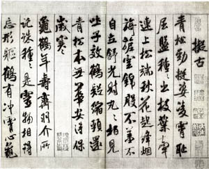 미불의 촉소첩은 1088년 9월에 호주(湖州)의 지주(知州)였던 임희(林希)의 초청을 받고 그의 청에 따라 자작시를 행서로 쓴 것이다. 미불의 나이 38세 때 작품으로 정연하고 유려한 진대의 행서풍으로 이루어져 있다. 촉소첩의 유래는 대략 이렇다. 호주의 지주 임희는 경력(慶曆) 4년(1044)에 촉의 동천(東川)에서 생산된 비단을 구하여 두루마리로 꾸며 놓고, 명필에게 글씨를 받을 생각을 하고 있었다. 여러 명사들을 초청하여 비단권을 자랑하던 임희는 희녕(熙寧) 8년(1075)에 진릉(晉陵)의 호완부(胡完夫)를 초청하여 비단을 보여주며 제식(題識)을 받았고, 원우(元祐) 3년(1088) 9월에는 미불을 초청하여 마침내 원하던 글씨를 받게 되었다. 여기에는 미불의 자작시 '의고(擬古)'를 비롯하여 오언시와 칠언시가 각각 4수가 쓰여 있다. 현재 첩의 앞에는 청나라 고종의 「米?書蜀素帖」 6자가 있고, 첩 뒤에는 호완부를 비롯하여 동기창, 심주, 축윤명, 고종의, 왕형, 동힐 등의 발문이 있다. 그 중에서 명나라 동기창은 "마치 사자가 코끼리를 잡으려고 전력 질주하는 것 같다"고 평하고 "이전에 촉소첩 모본을 얻어 희홍당첩에 새겨 넣었는데 갑진년(1604) 5월에 오정(吳廷)에게 진적을 양도받았다"고 소장내력을 소개하였다. 동기창의 글씨가 미불과 흡사한 하나의 이유를 여기에서 발견한다. 횡획의 기필이 수필보다 무겁게 되어 있으며 결구가 좌측으로 기운 모습은 미불 행서의 특징이다.