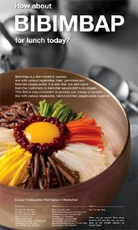 뉴욕에서는 건강한 음식을 찾는 웰빙 바람과 함께 햄버거나 피자를 대신할 음식으로 비빔밥이 관심을 끈다. 몸에 좋은 여러 야채와 밥, 고기, 입맛에 맞는 소시를 원하는 대로 즐길 수 있기 때문이다.