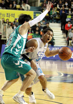 58대49로 9점 뒤진 채 4쿼터를 맞이한 KCC는 강병현과 '불꽃슈터' 이동준의 3점 슛이 림에 꽂히면서 막판 추격에 나섰지만 공·수 리바운드를 장악한 김주성과 마퀸 챈들러의 골밑 슛이 연이어 터지면서 역전을 허용하지 않았다.