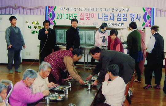 한국음식업중앙회전북도지회 장수군지부 박찬극 지부장을 비롯한 지부임원들은 지난 19일 장수읍 무료노인요양시설인 장수수양원을 찾아 설맞이 '나눔과 섬김'행사를 갖고 노인 100여명에게 직접 끓인 떡국으로 점심을 대접했다.