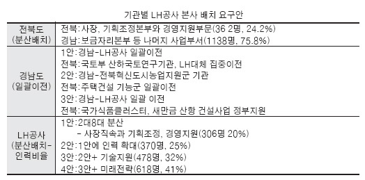 당시 제출된 전북도와 LH공사의 방안은 'LH공사 본사 분산배치'를 기본방향으로 삼고 있다.(표)