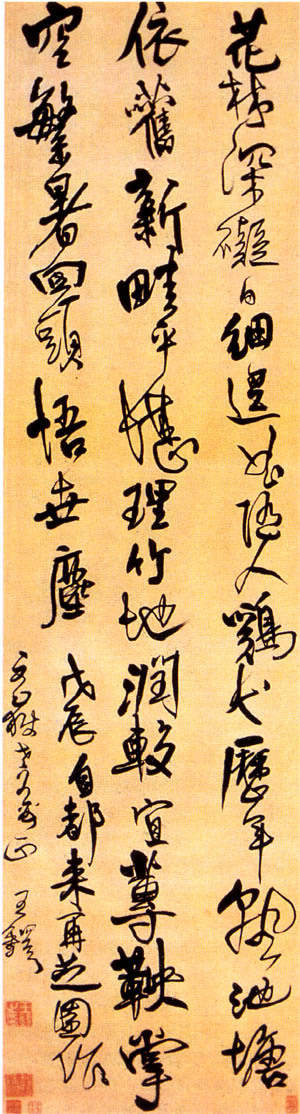여기에 소개하는 '자작오율'은 말 그대로 자신이 지은 오언율시를 흥을 실어 쓴 것이다. 임리한 발묵과 얽매임이 없는 자유분방한 운필이 묵훈을 이루고, 기이한 결구와 공간분할이 신기(新奇)를 자아낸다. 방원(方圓)이 곡절하고 억양돈좌하며 전변하는 필획에서 그의 복잡한 정감과 분개, 비애 등 다층적인 심미적 가치를 느낄 수 있다. 그의 서품을 보노라면 문득 그가 "萬事不如杯在手"(만사가 손에 든 잔처럼 마음대로 되지 않는다)라고 한 말이 떠오른다. /이은혁(한국서예문화연구회 이사장)