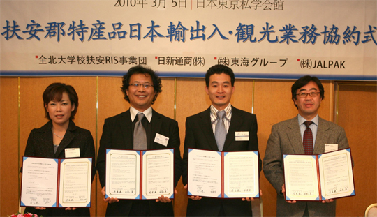 전북대 부안지역연고육성사업단(단장 이양수·이하 부안RIS사업단)이 지난 5일 일본 도쿄 치요다구에 위치한 아카디아 이치가야 사학회관에서 일신통상, 동해그룹, JALPAC 등 일본 주요기업 대표자들과 부안군 특산품의 일본수출과 일본 관광객 부안 유치를 위한 양해각서를 체결했다.